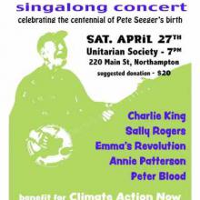 Pat Humphries of Emma's Revolution was at Pete Seeger's bedside as he died, singing to him. Pat and Sandy O of Emma's Revolution, along with Sally Rogers, Charlie King, Annie Patterson, and Peter Blood, join in the post-intermission part of a concert to celebrate the 100th anniversary of Pete Seeger's birth, held April 27th in Northampton, MA, at the Unitarian Society, as a benefit for Climate Action Now MA, part of a wealth of events for the 100th anniversary.