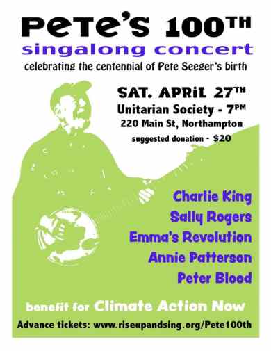1st part of a concert to celebrate the 100th anniversary of Pete Seeger's birth, held April 27th in Northampton, MA, at the Unitarian Society, as a benefit for Climate Action Now MA, part of a wealth of events for the 100th anniversary. This concert includes performances by Emma's Revolution, Sally Rogers, Charlie King, Annie Patterson, and Peter Blood.
