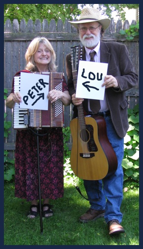 Lou & Peter Berryman are known for their unstoppable humor & wordplay, and for their distinctive guitar & accordion instrumentation. Based in Madison, WI, they've churned out many hundreds of songs on topics large & small, staving off the weight of the world with terminal laughter syndrome. There's no one like them as you will know by browsing their Lou & Peter's Big Songbook.